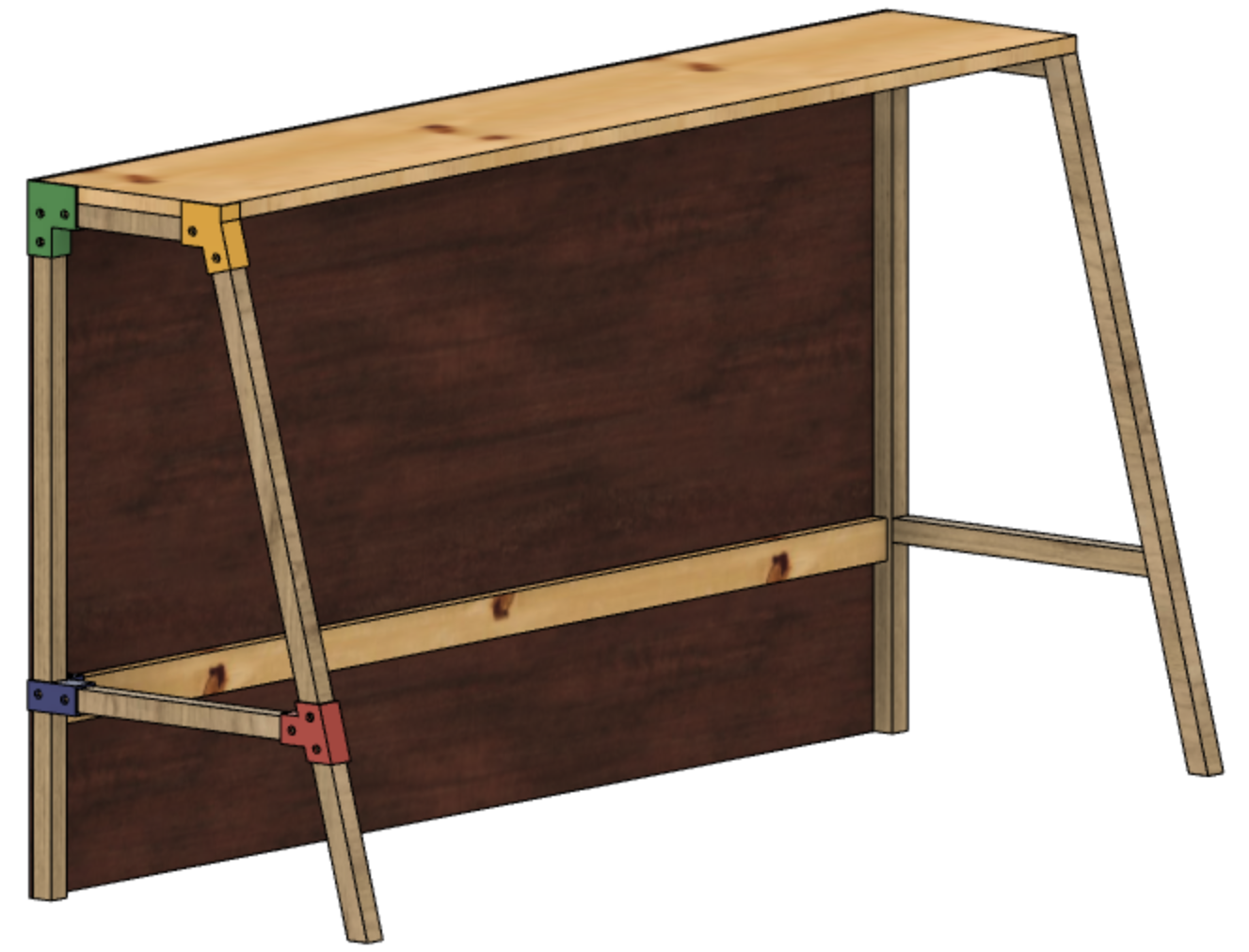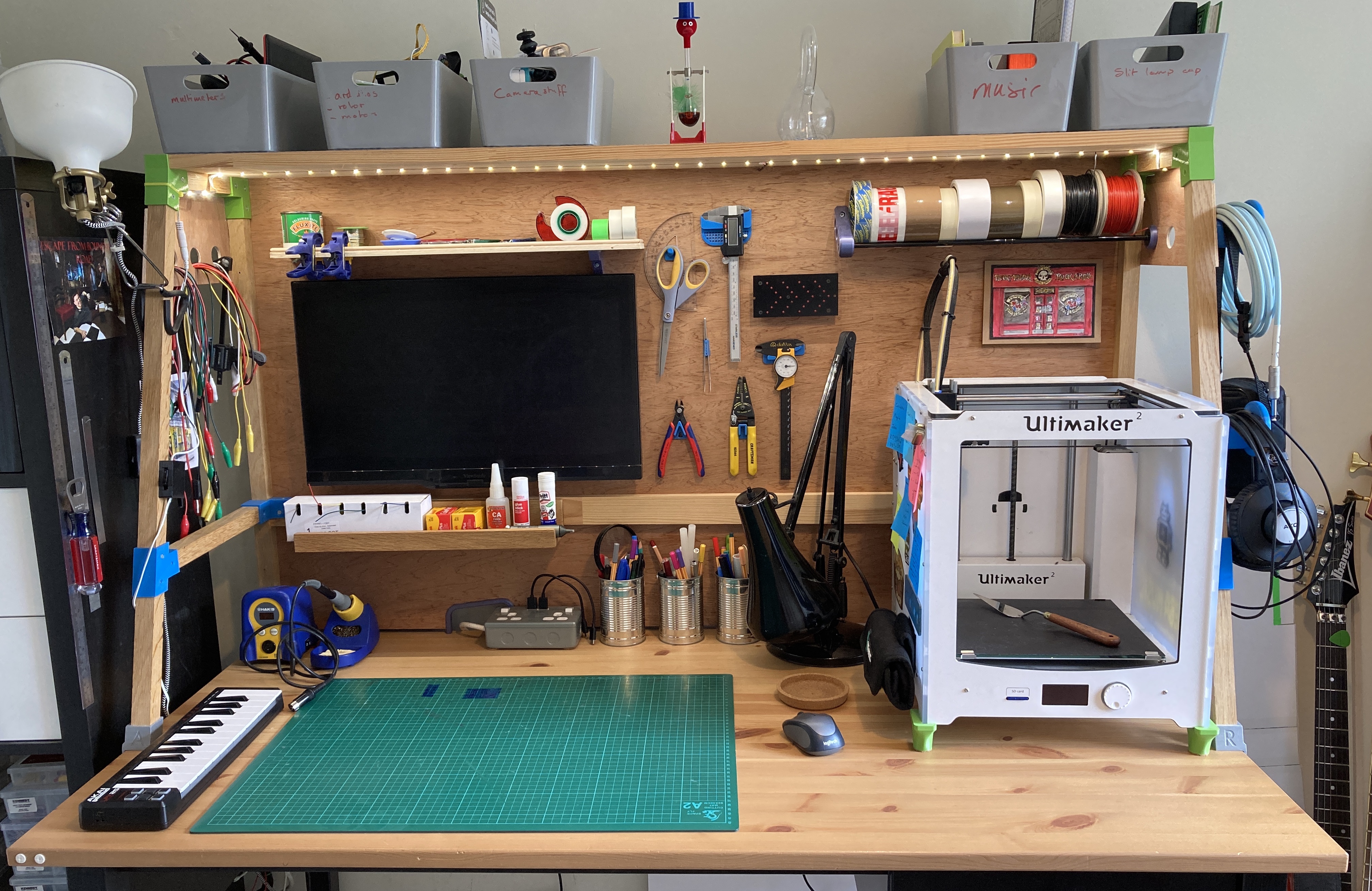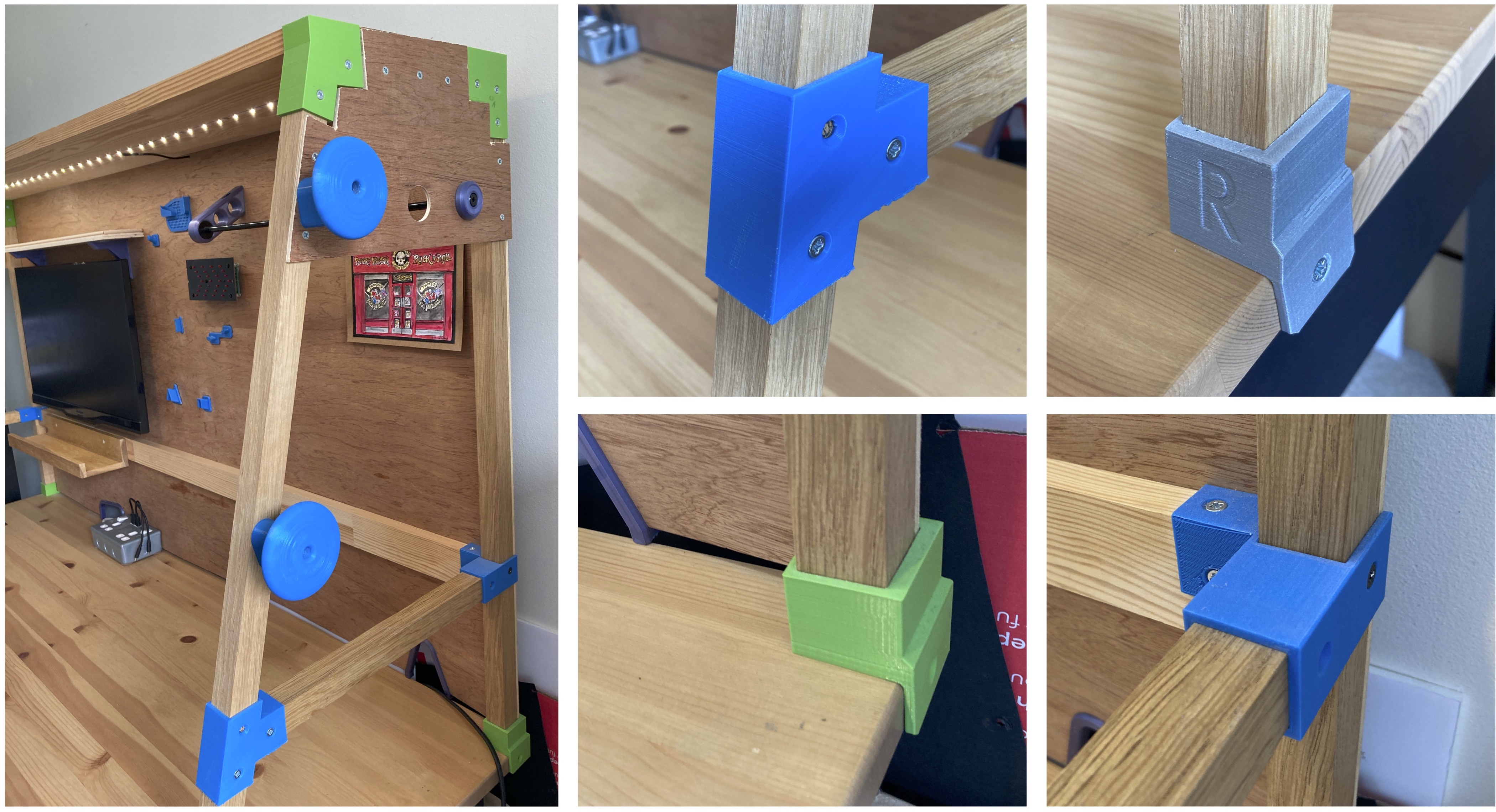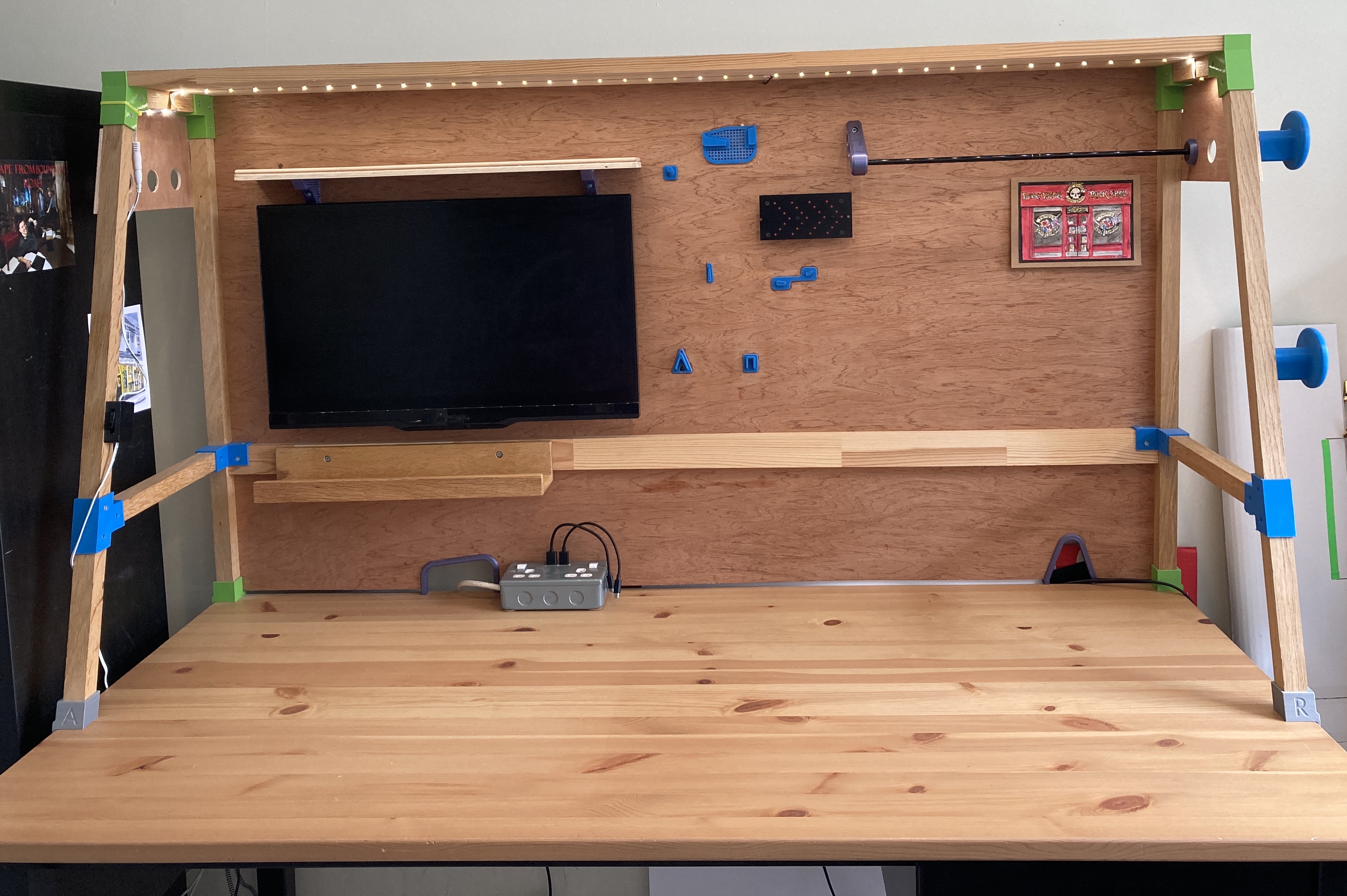 As you can see the desk has really become a workbench with a mounted screen and hooks for tools. The wooden frame is built from 2.5 cm^2 pieces of oak and is joined using 3D printed brackets, these worked well and the frame is very sturdy in all directions.