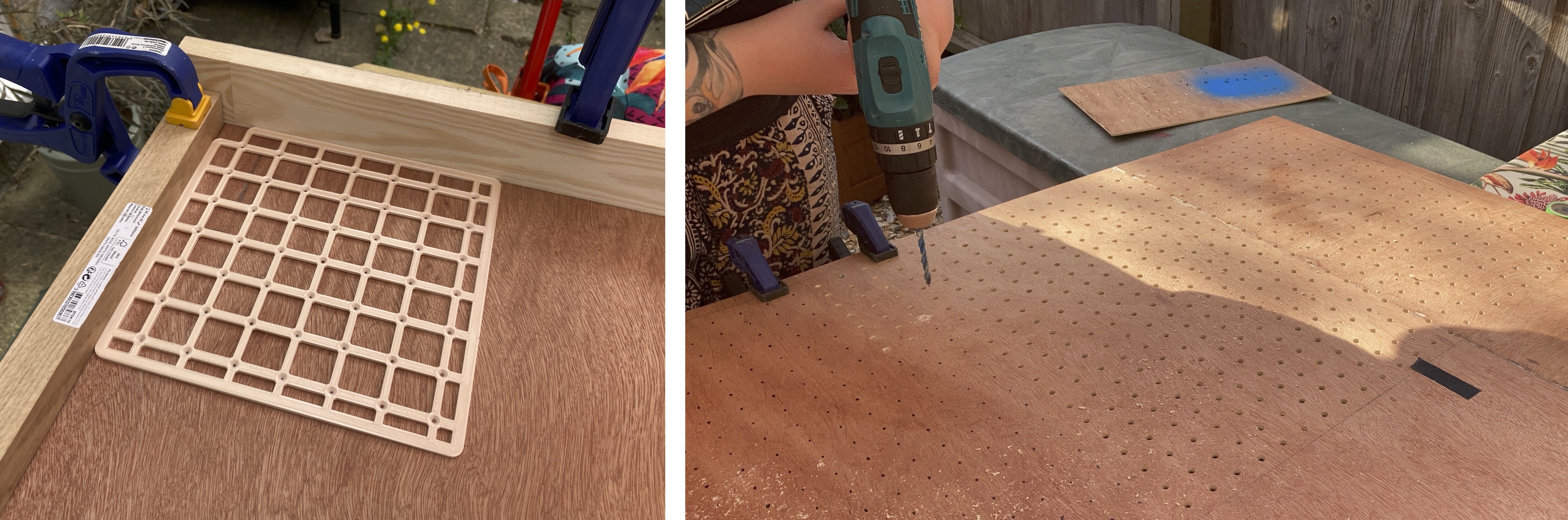 This one has a pegboard backboard. To buy pegboard, it turns out, is quite expensive. So instead we drilled 1056 holes into a sheet of plywood over a series of days, using a template to get the spacing correct. The result was almost worth it.