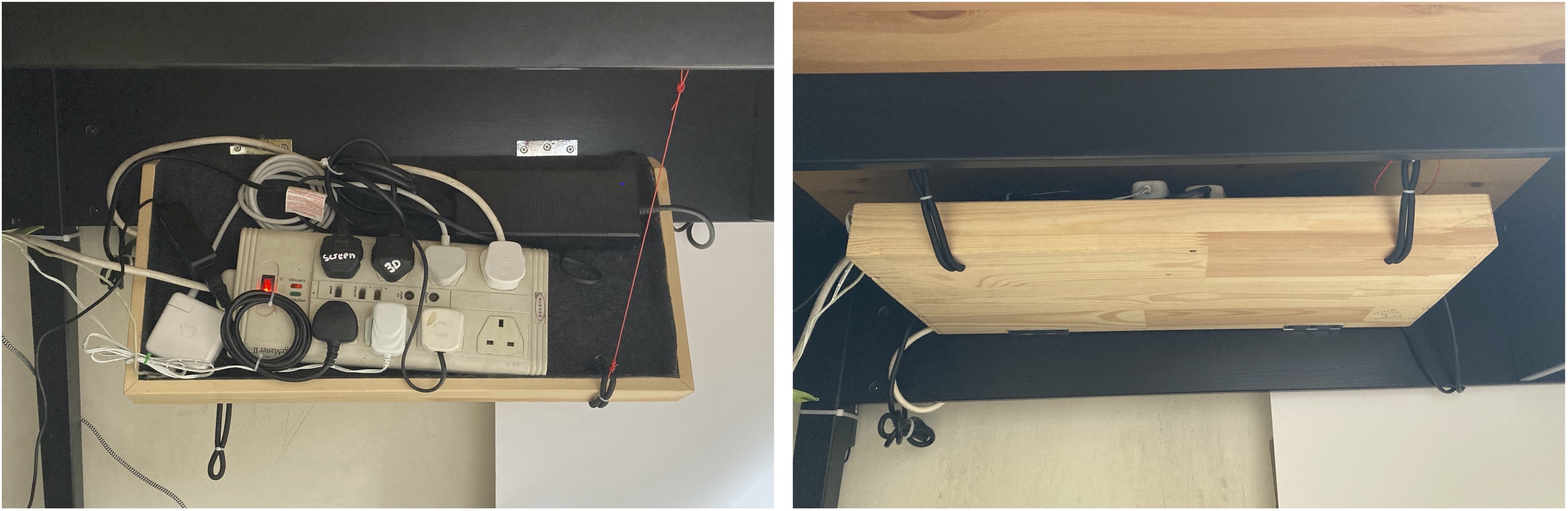 I would highly recommend this modification to anyone with a desk and lots of wires underneath it. All you really need to do is hinge some sort of box, or even piece of wood, to the underside of the desk and find a way to latch it. Clearing the wires from the floor is very satisfying.
