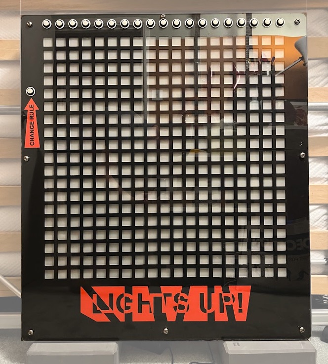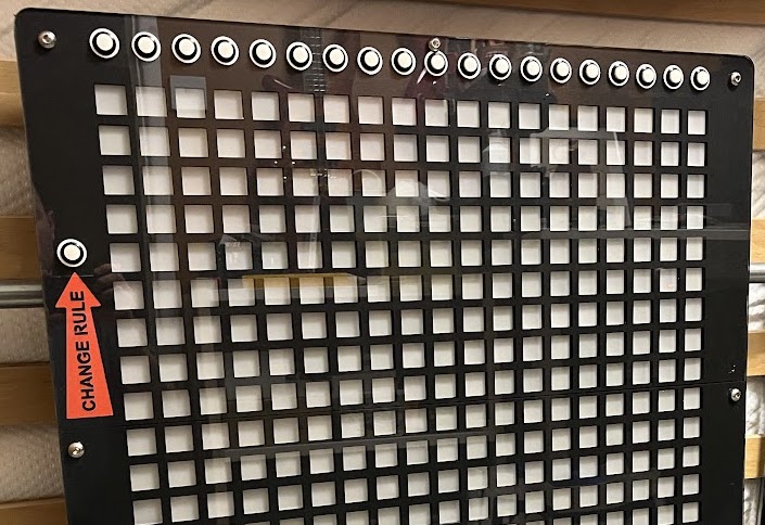 Pushing one of these buttons changes the state of the light just below it. As soon as you change one of the lights in the top row the rows below update based on the current rule set. This continues row by row to the bottom on the board. The effect is a waterfall of change based on a seemingly small change to the top row. This ‘butterfly effect’ leads to new patterns emerging on the board.