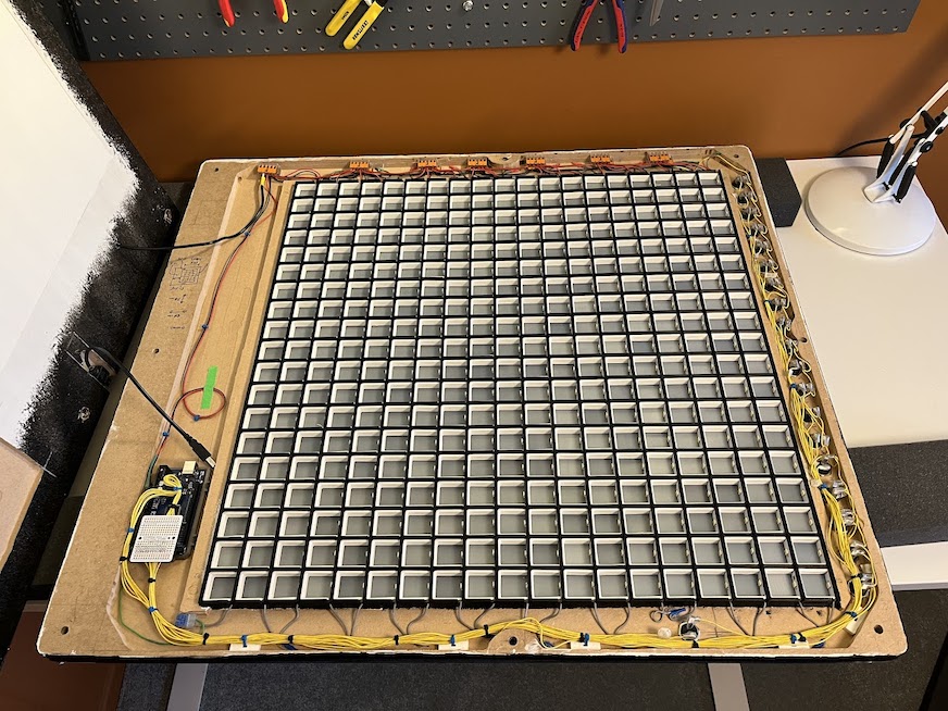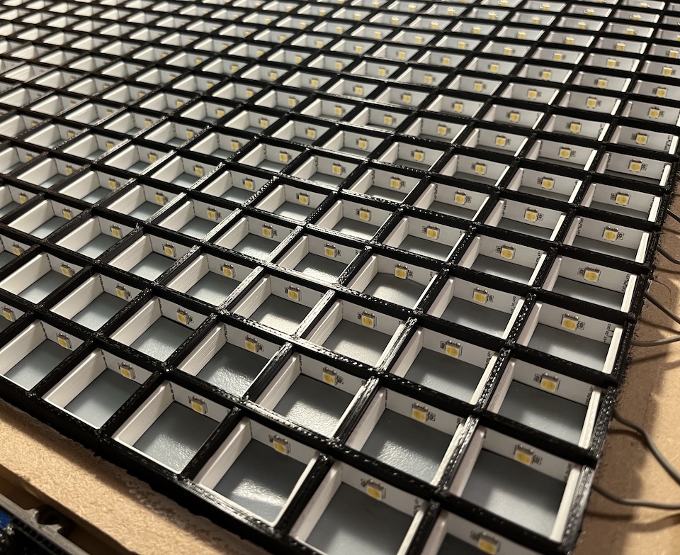 The middle layer is an mdf frame with the centre made up of many 3D printed windows. These form a grid to hold the LED lights in place. Each light module consists of one addressable white LED held in a square compartment. Each compartment has a piece of frosted plastic at the front to diffuse the light.