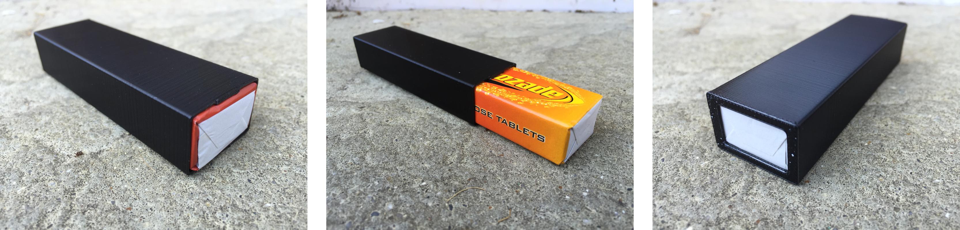 The case is 3D printed and to keep things simple it is a single piece design with small protrusions at the opening to hold the tablets in place and a hole at the bottom to help get them out. The other benefit to the case is that if you eat some of the tablets (half a pack is about right for me) you can keep the rest in the case without further mess.