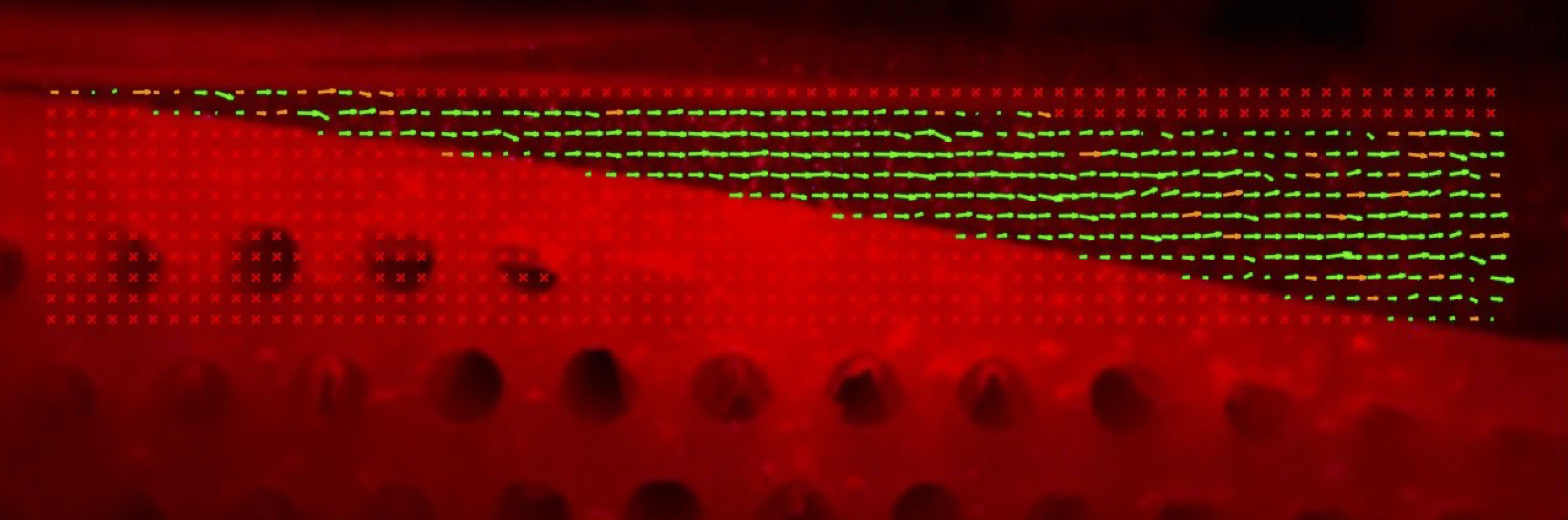 To measure the speed of fluids during a ‘swallow’ I used a technique called Particle Image Velocimetry. This process tracks the position of many small particles shown in a 2D plane of a moving fluid to produce a velocity vector field.