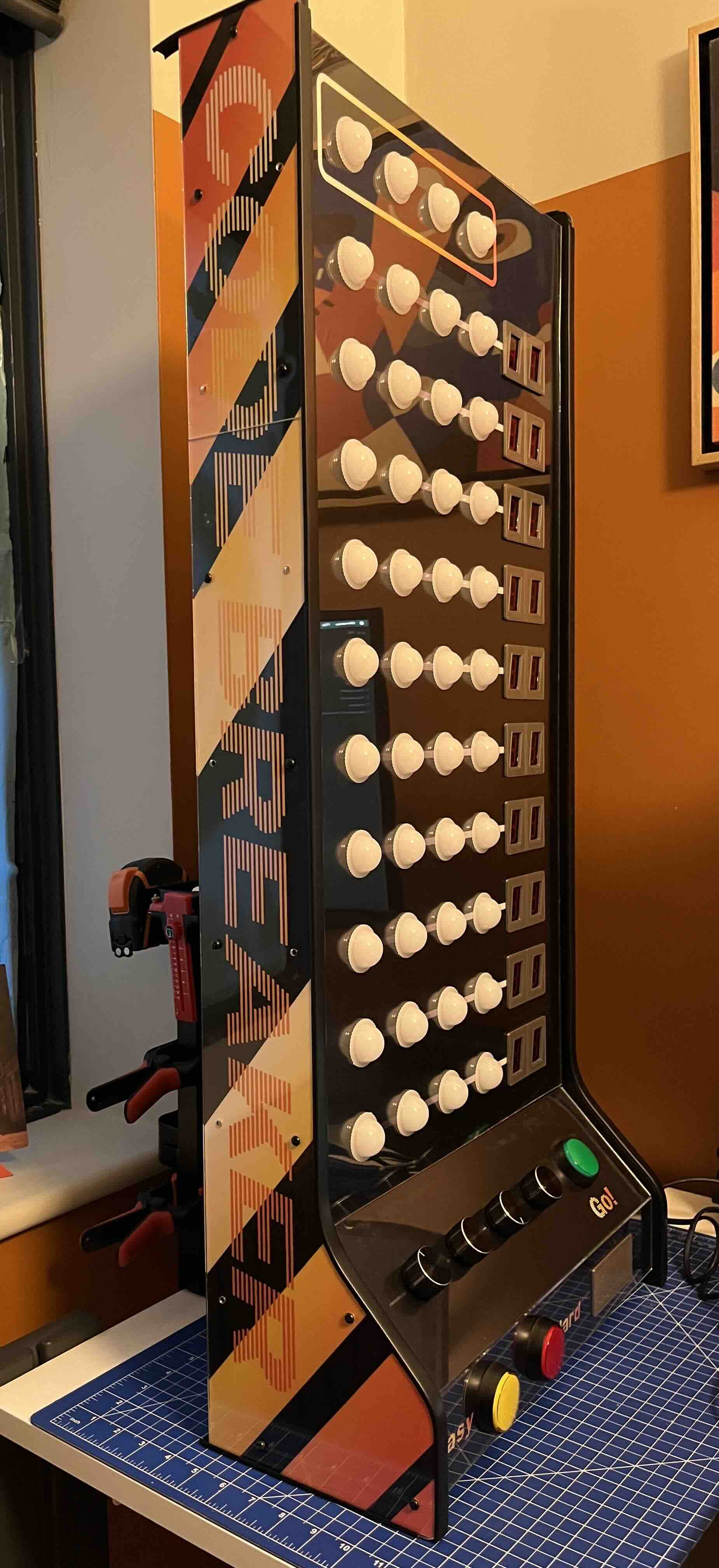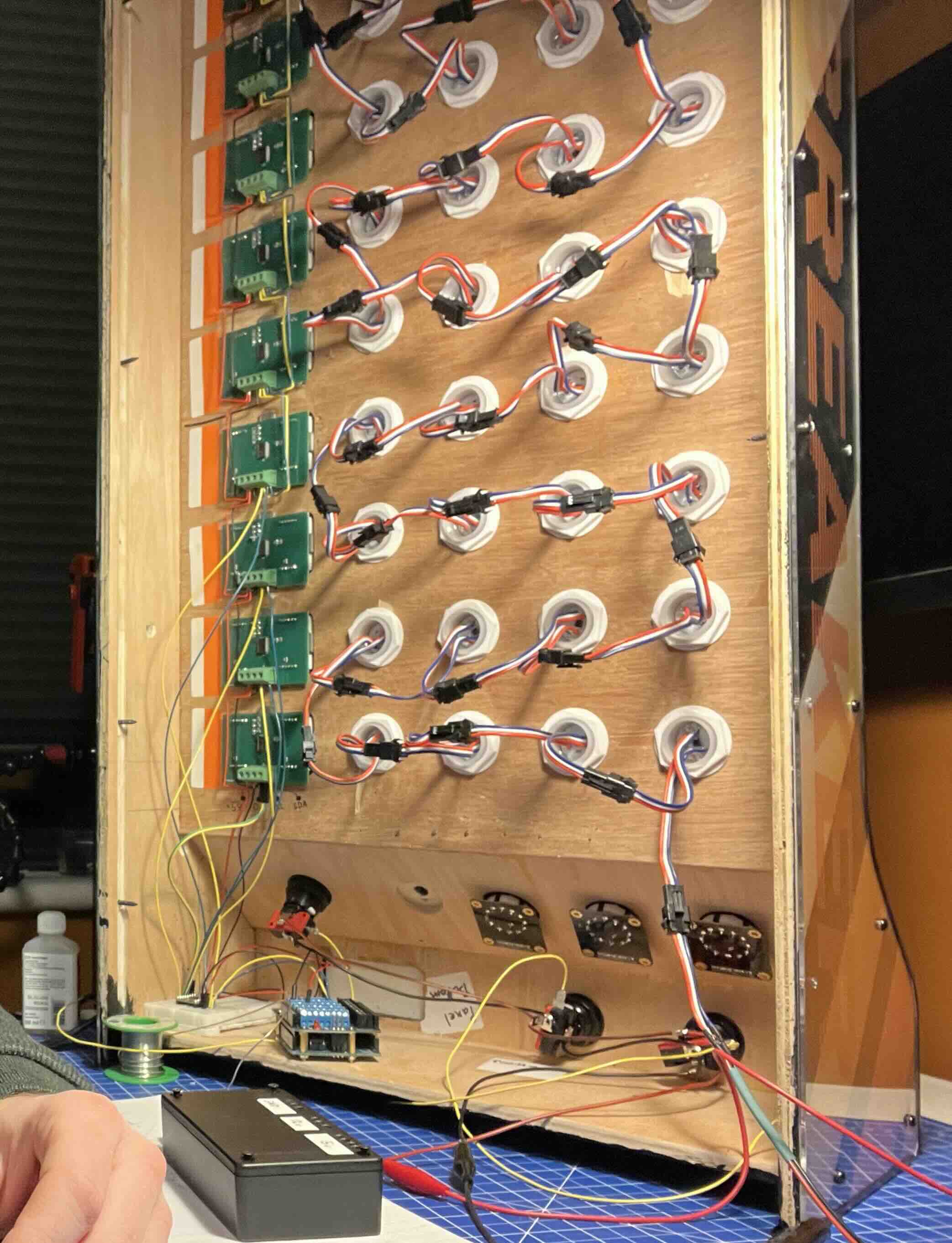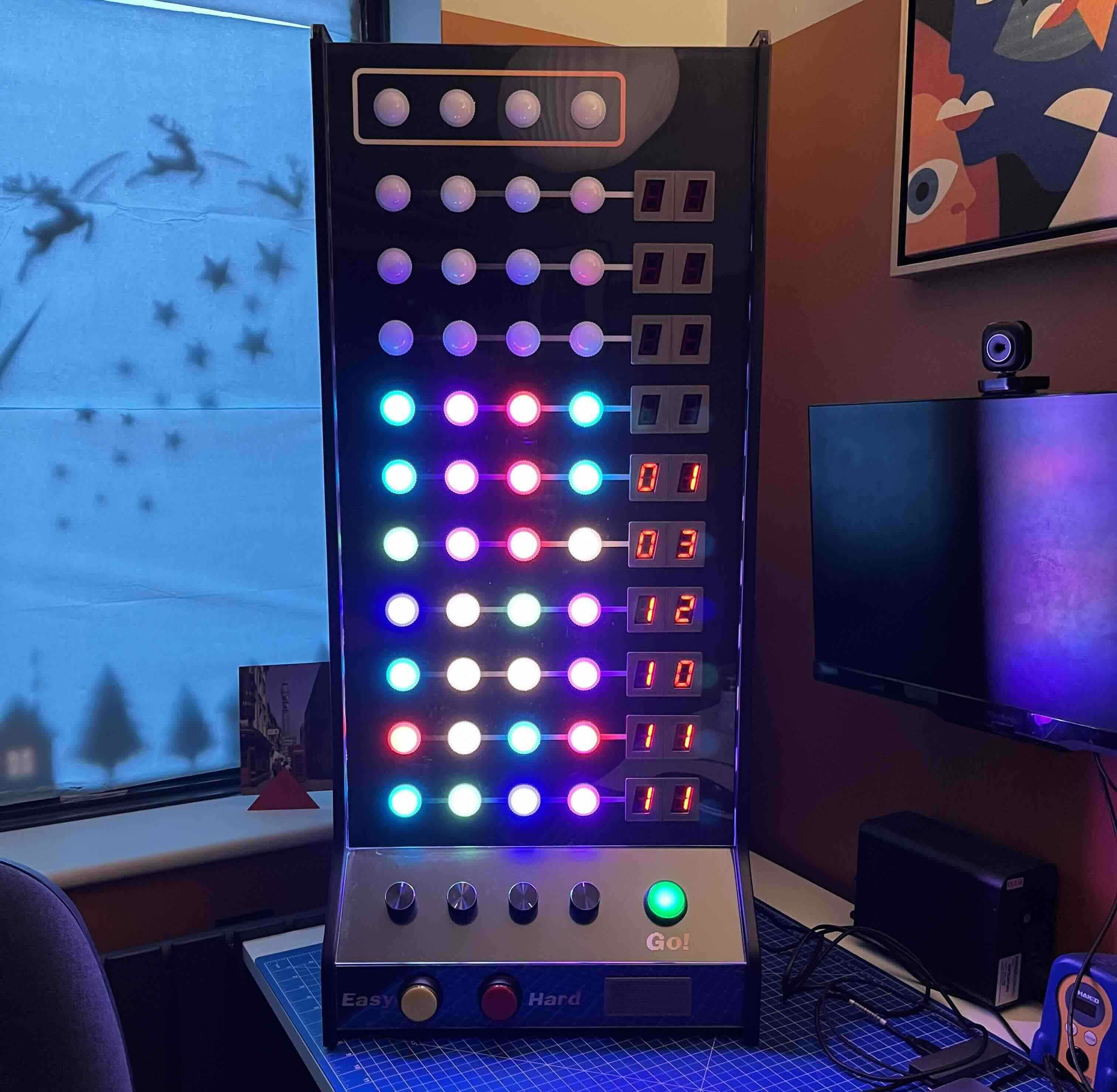 The electrical system has an arduino to control everything and the game is programmed in C++. Each light is a RGB adressable LED with seven segment displays to show the score. The addition of game sounds really makes the play experience more engaging.
