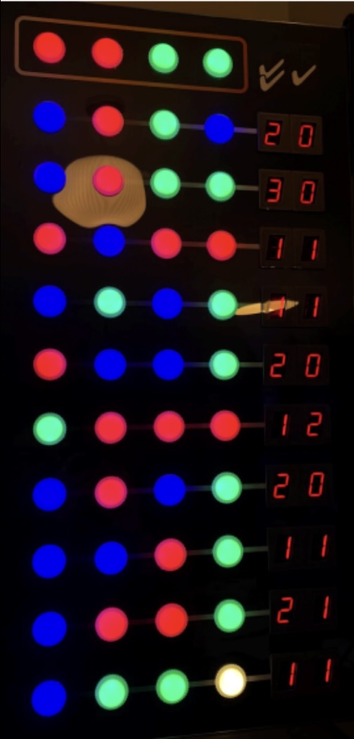 After each guess two numbers are shown. The first is how many lights are the correct colour and in the right position. The second tells you how many are the correct colours but in the wrong position. So if you guess all four correct you will see 4-0. Below is a video of me playing the game (badly).