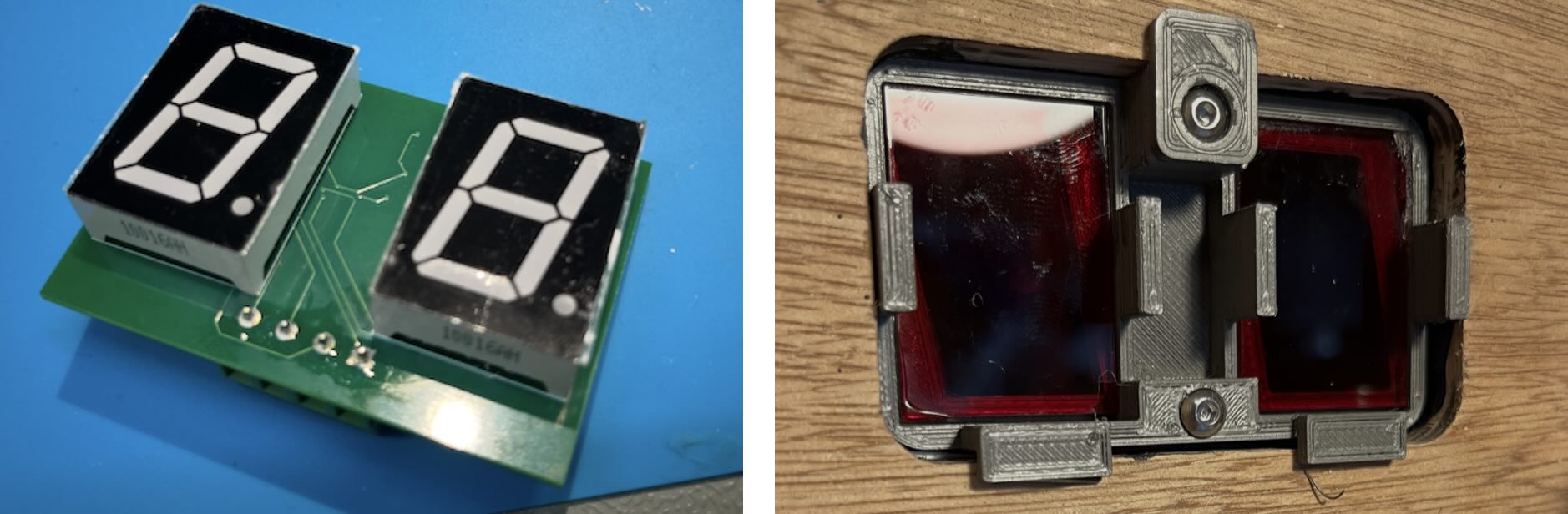 The seven segment display had to be custom made as I could not find a suitable off the shelf part. The PCB was designed to fit two large size displays controlled by an i2c I/O expander chip. These fit into a 3D printed housing with red perspex.