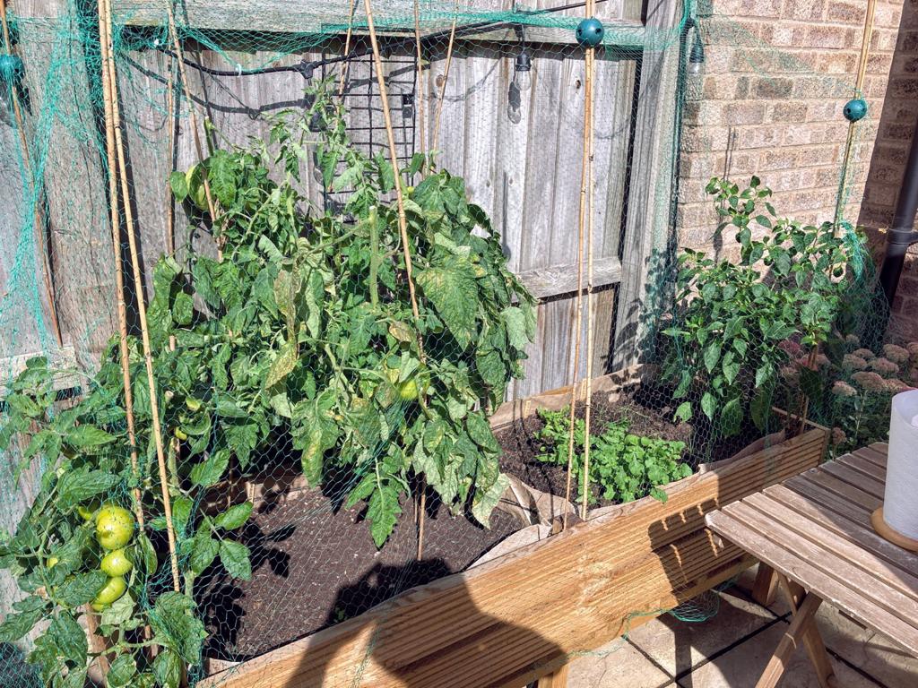 To make up for lack of planting space in the garden I built a planter out of desking wood and fence featherboard. The size was designed around existing growbags.