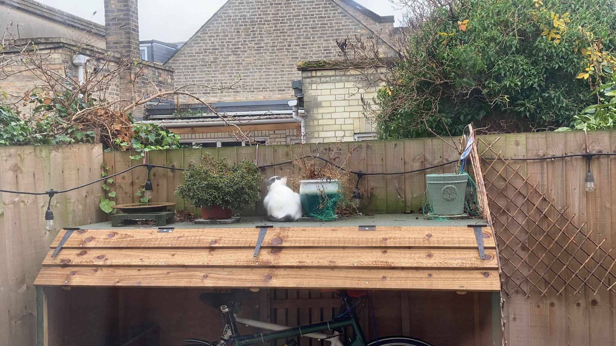 Initially the idea was to have a pitched roof to help with rain, but as our garden is small we went for a flat roof to have some space for plant pots (and the neighbours cat). A small flap at the front helps make it less boxy and is sealed on all sides with rubber strips. The shed has survived a few winters now and the only bit that didn't survive was the flap, so a new one made of fencing featherboard has replaced it.